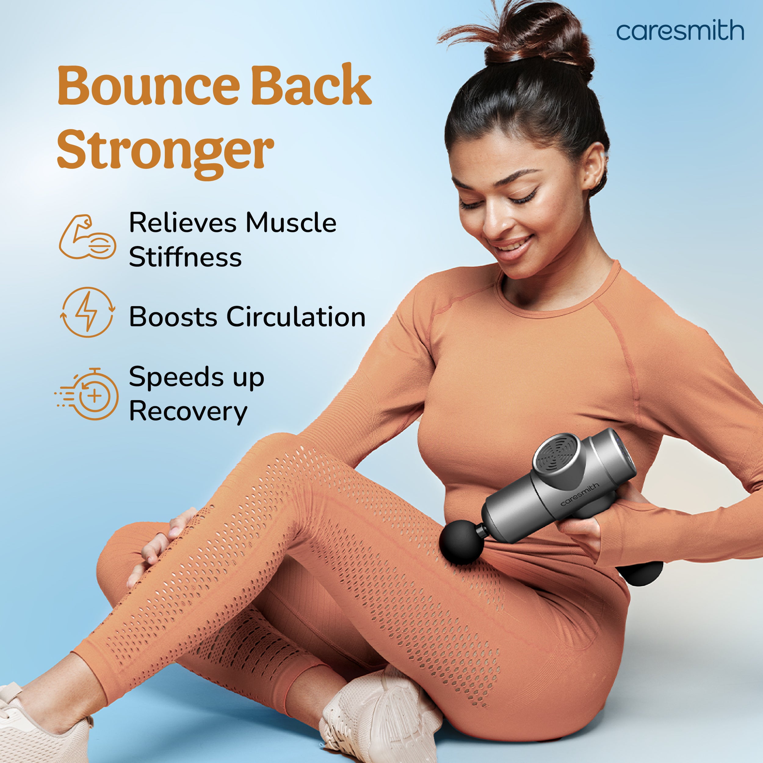 The Caresmith Charge Boost Max Massage Gun is cordless, ultra-light (650g), and easy to use. It features a digital touchscreen for easy control, 4 versatile heads, 10 adjustable speeds, a powerful 24W motor, and a 3.5-hour battery life, delivering deep muscle relief anytime, anywhere.